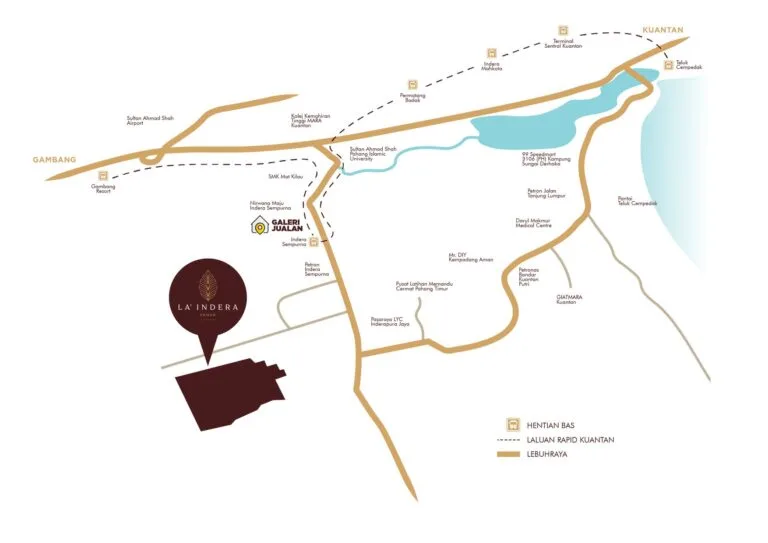 Terletak di kawasan strategik di antara bandar Kuantan dan Pekan yang meriah, projek ini menawarkan keseimbangan sempurna antara kemudahan dan ketenangan. Hanya dalam jarak 15 minit pemanduan yang singkat, anda boleh menikmati keindahan pantai berdekatan seperti Pantai Cempaka dan Pantai Kempadang, sesuai untuk mereka yang ingin bersantai di tepi laut.