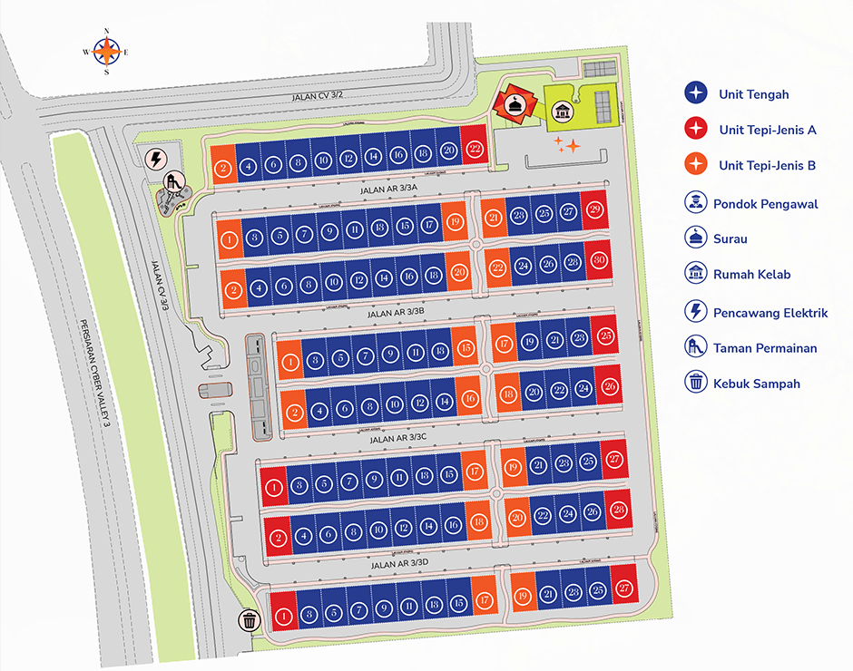 • Kemudahan: Sekuriti Guard, cctv, Dewan, Gelanggang Badminton, Surau, Taman Permainan, Gymnasium & Trek Jogging.